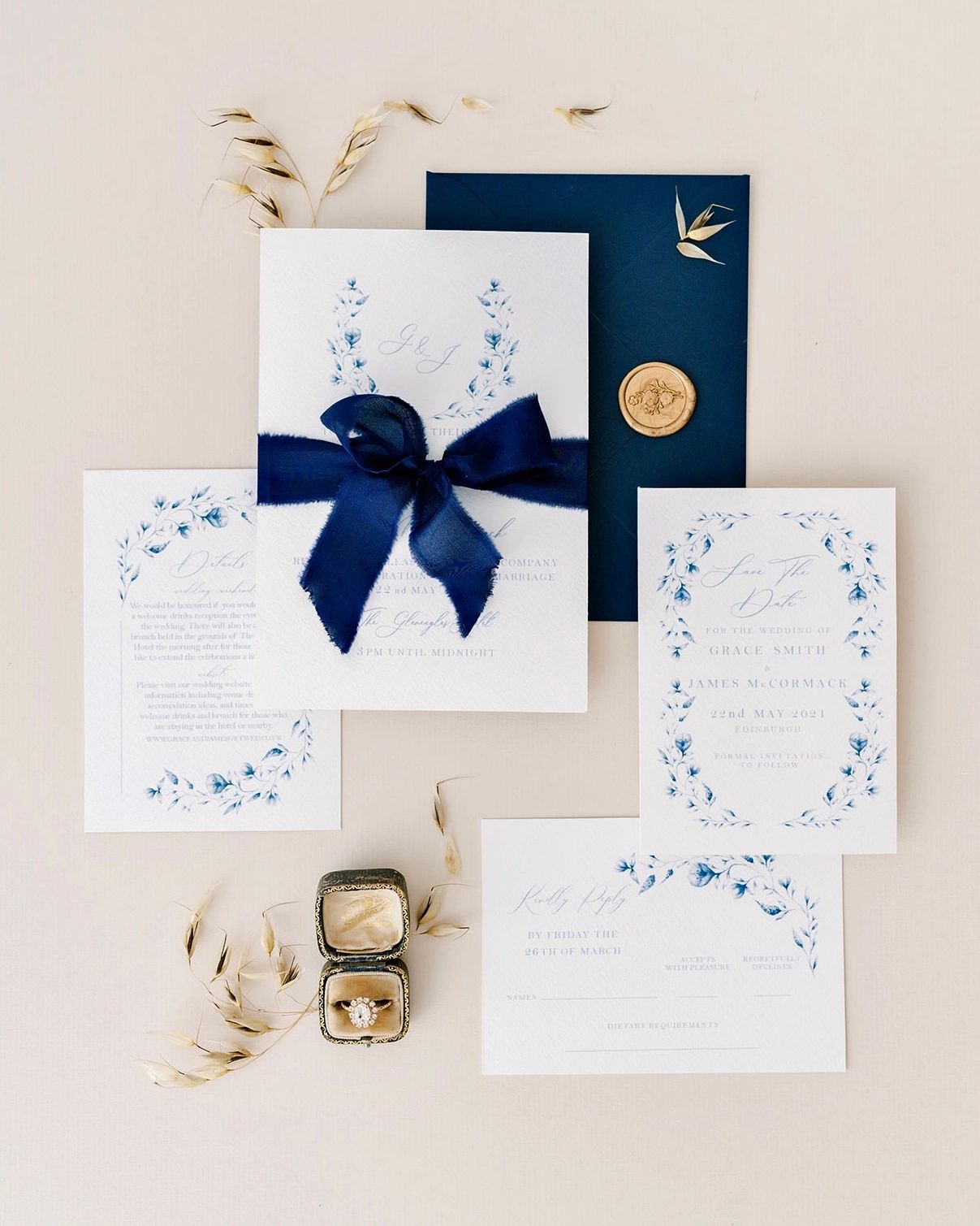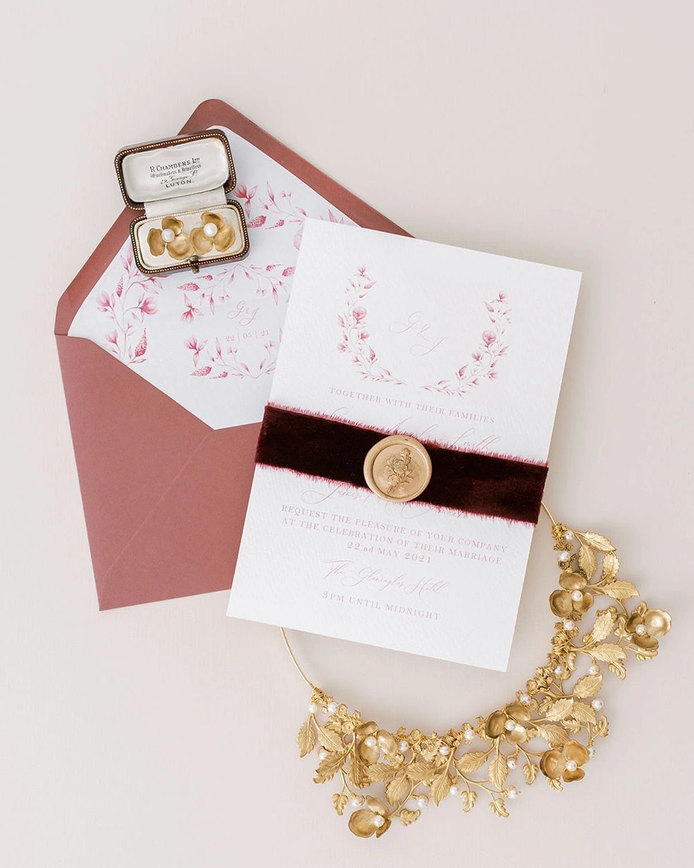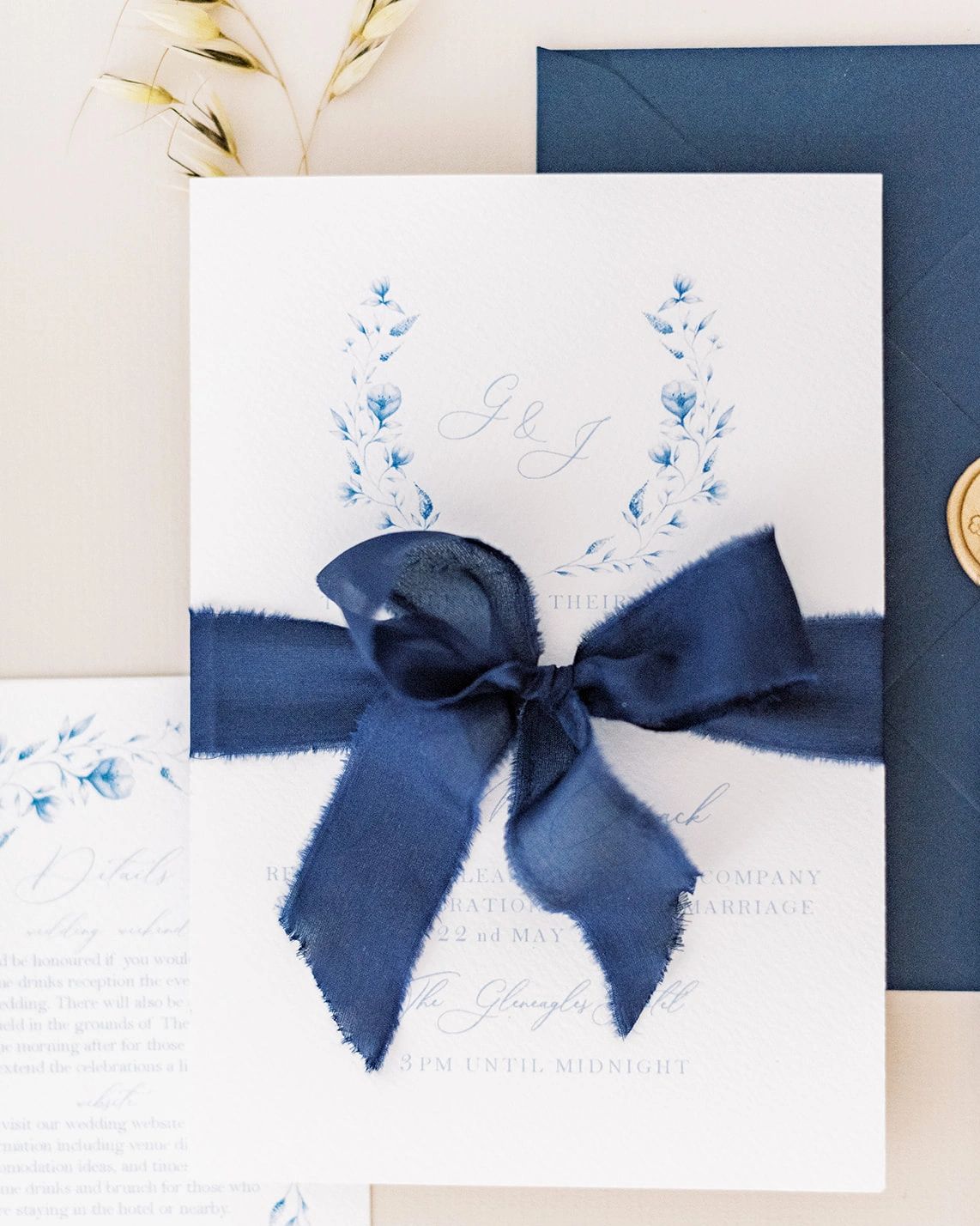 Finishing touches such as silk ribbons, wax seals and luxury coloured envelopes can be added to all designs in our collection of semi-custom wedding invitations.