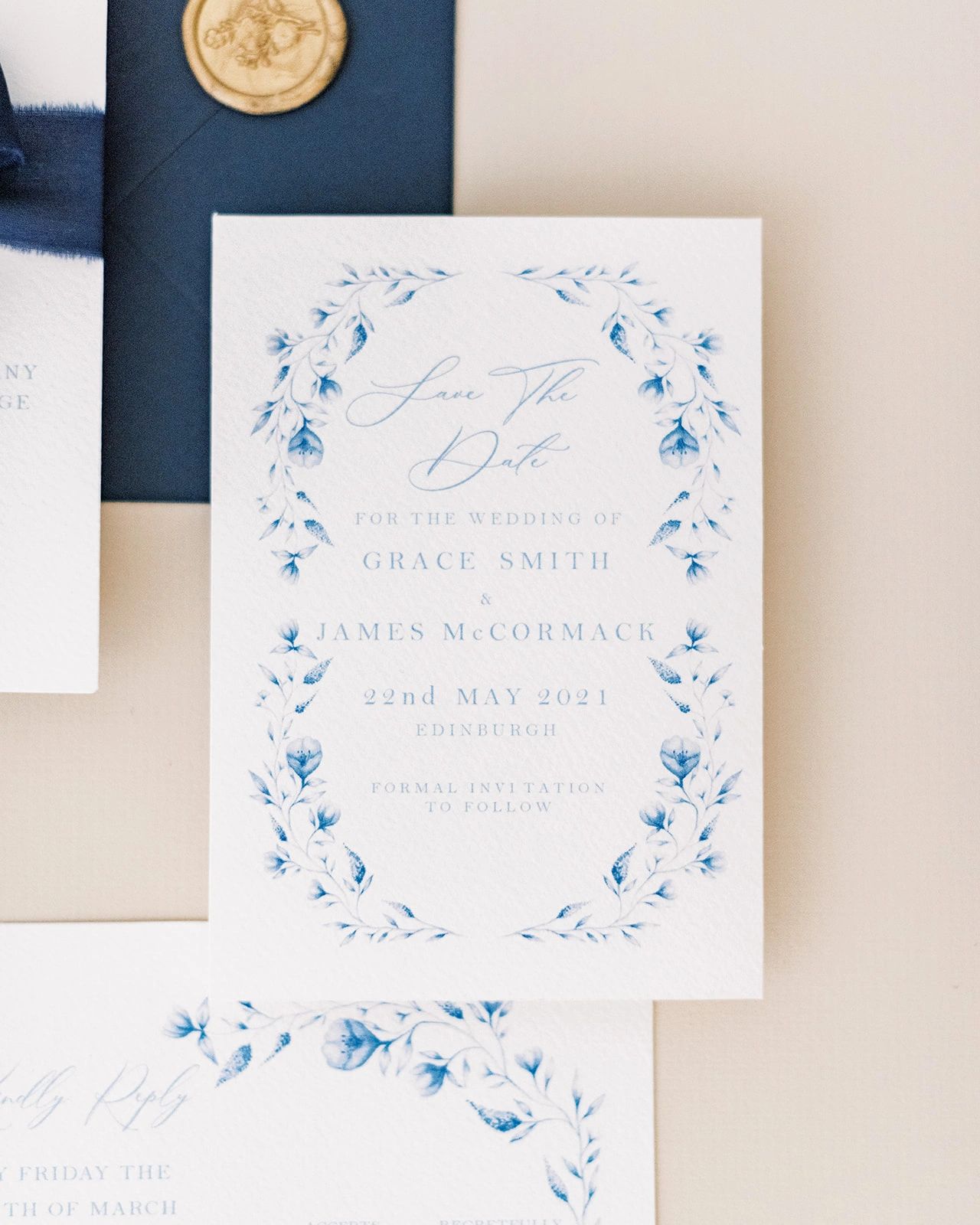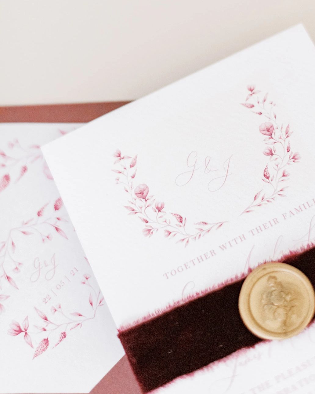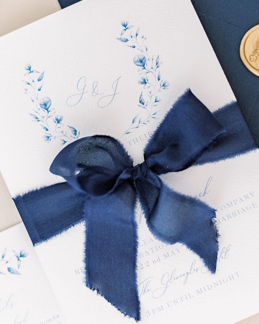 Finishing touches such as silk ribbons, wax seals and luxury coloured envelopes can be added to all designs in our collection of semi-custom wedding invitations.