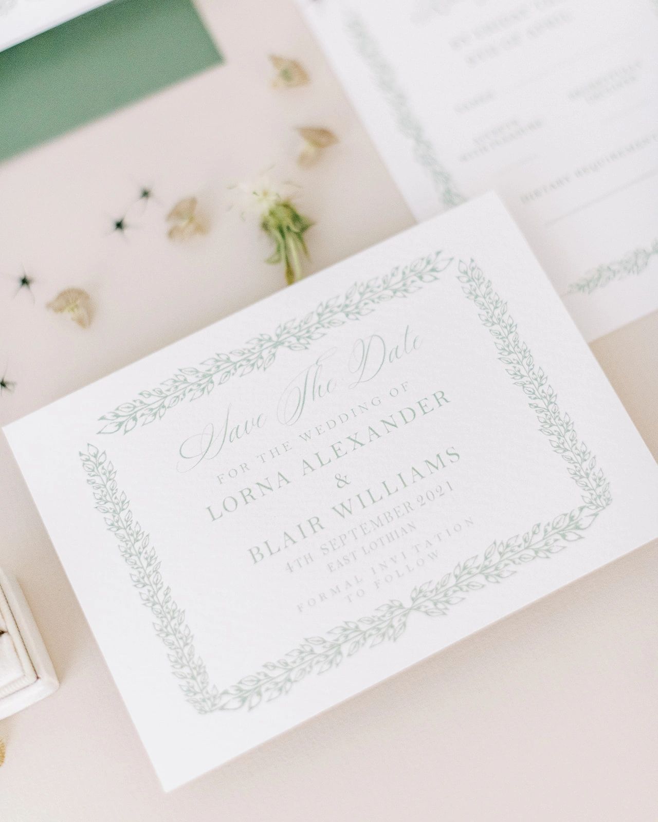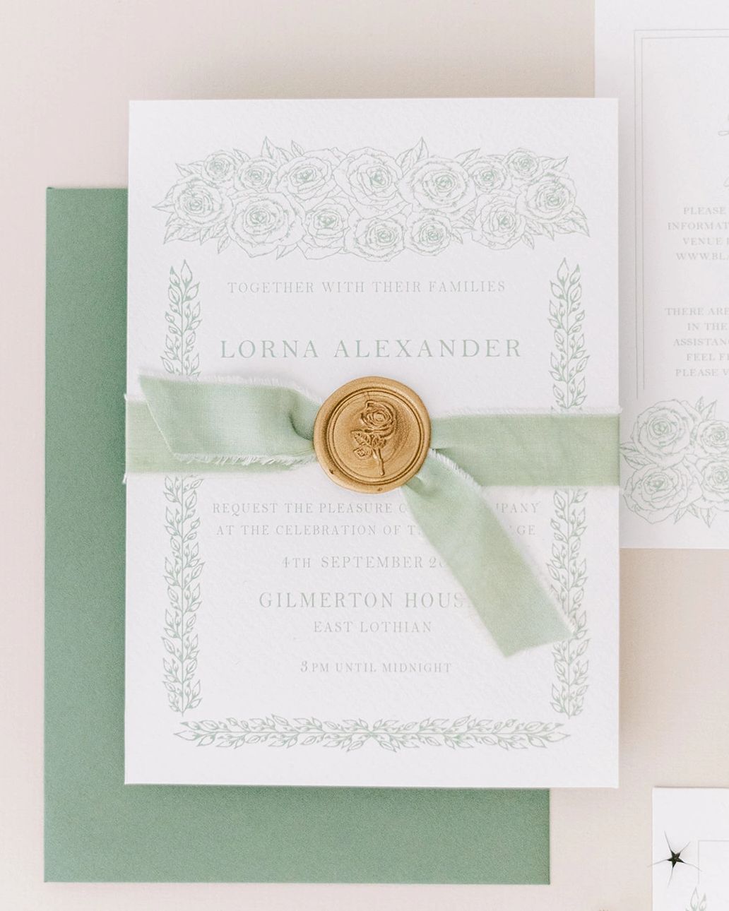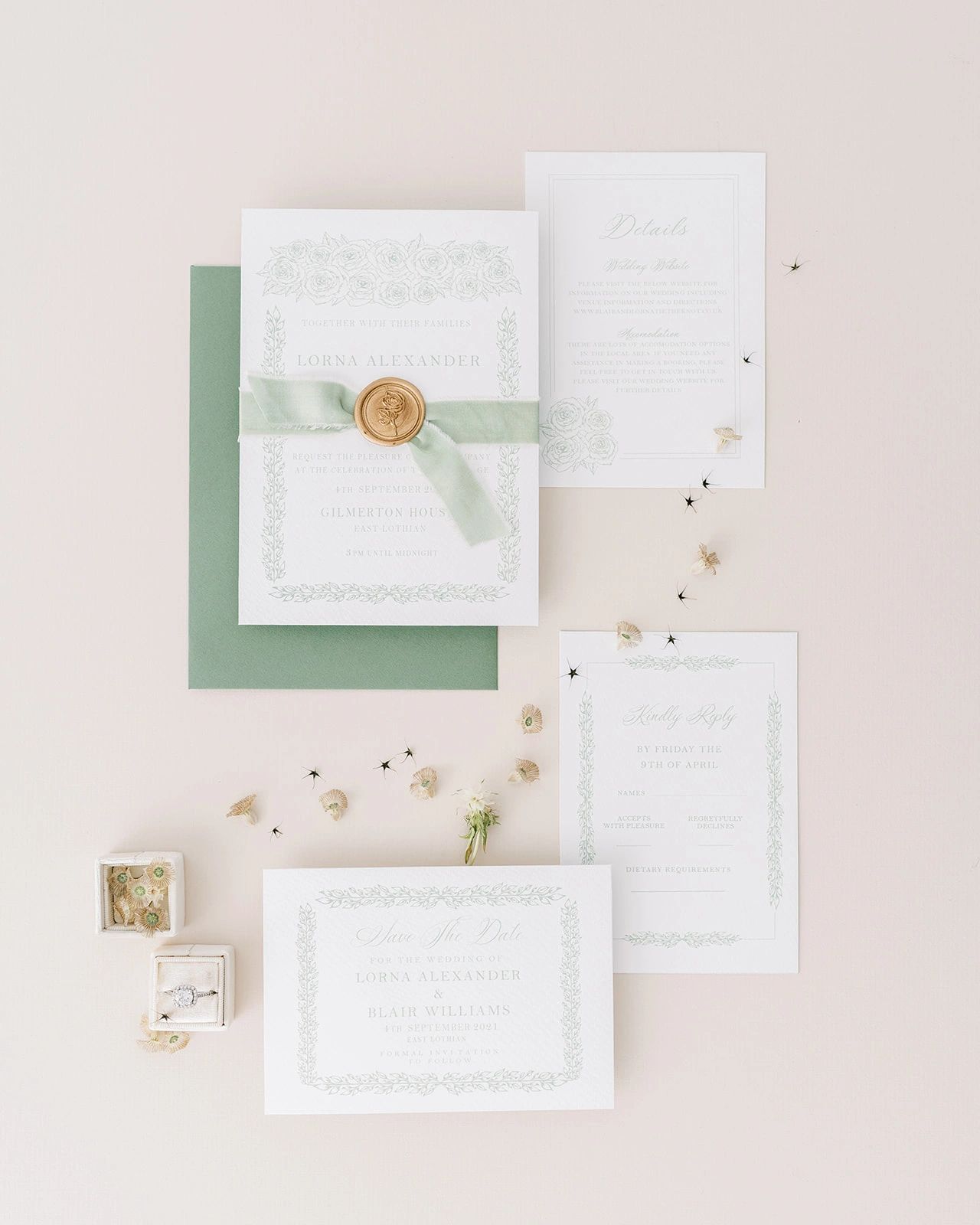 The ink colour of this suite can be changed to suit your wedding and luxury coloured envelopes can be added as an upgrade. As with all of the collections, optional finishing touches such as wax seals and silk ribbons can be added to complete your romantic wedding stationery.